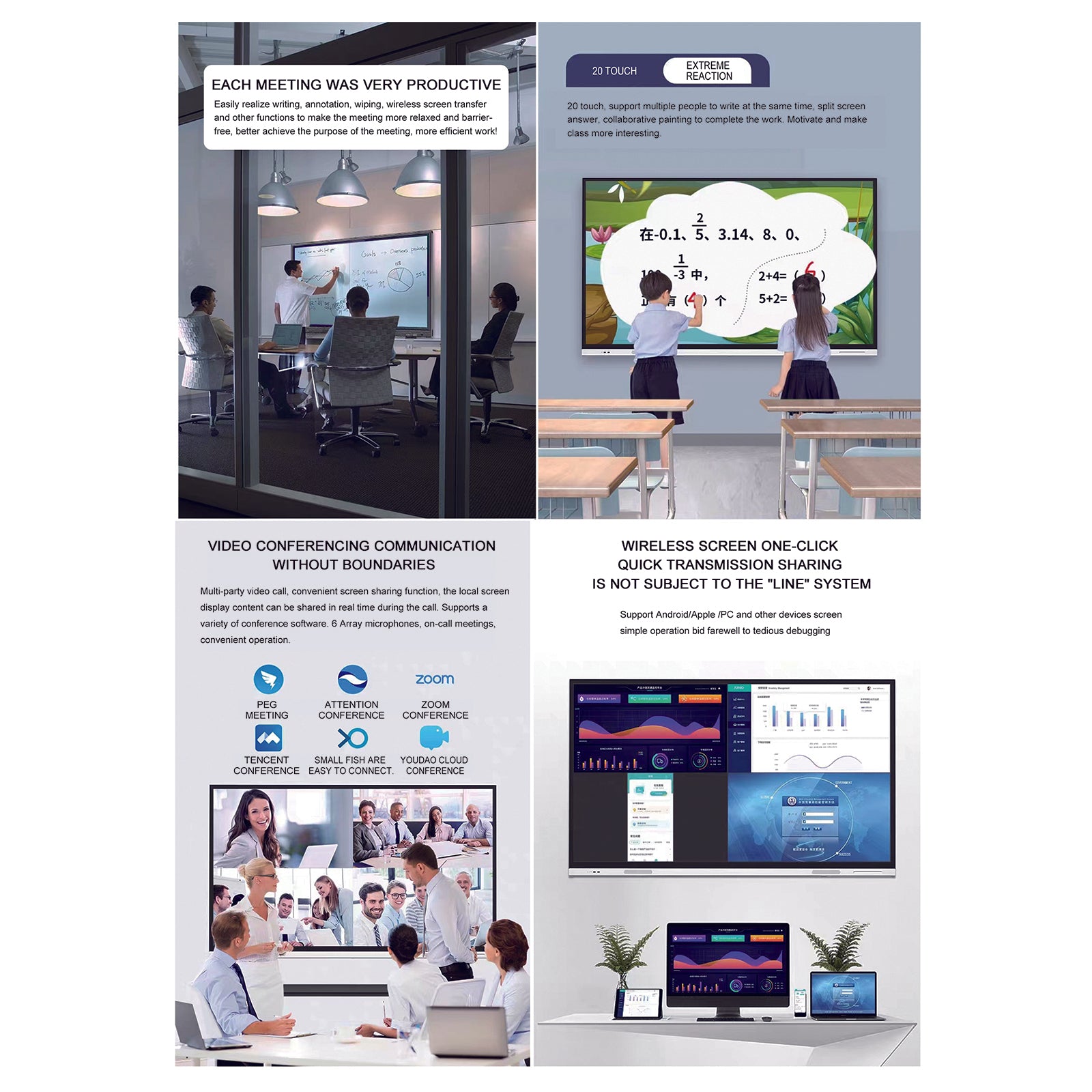 - 【Enhanced Video Conferencing Experience】Smart board interactive whiteboard works with any major video conferencing software like Zoom, Google Meet, Webex, GoToMeeting. Support muti-party video call, convenient screen sharing in real time, provide a better meeting experience.