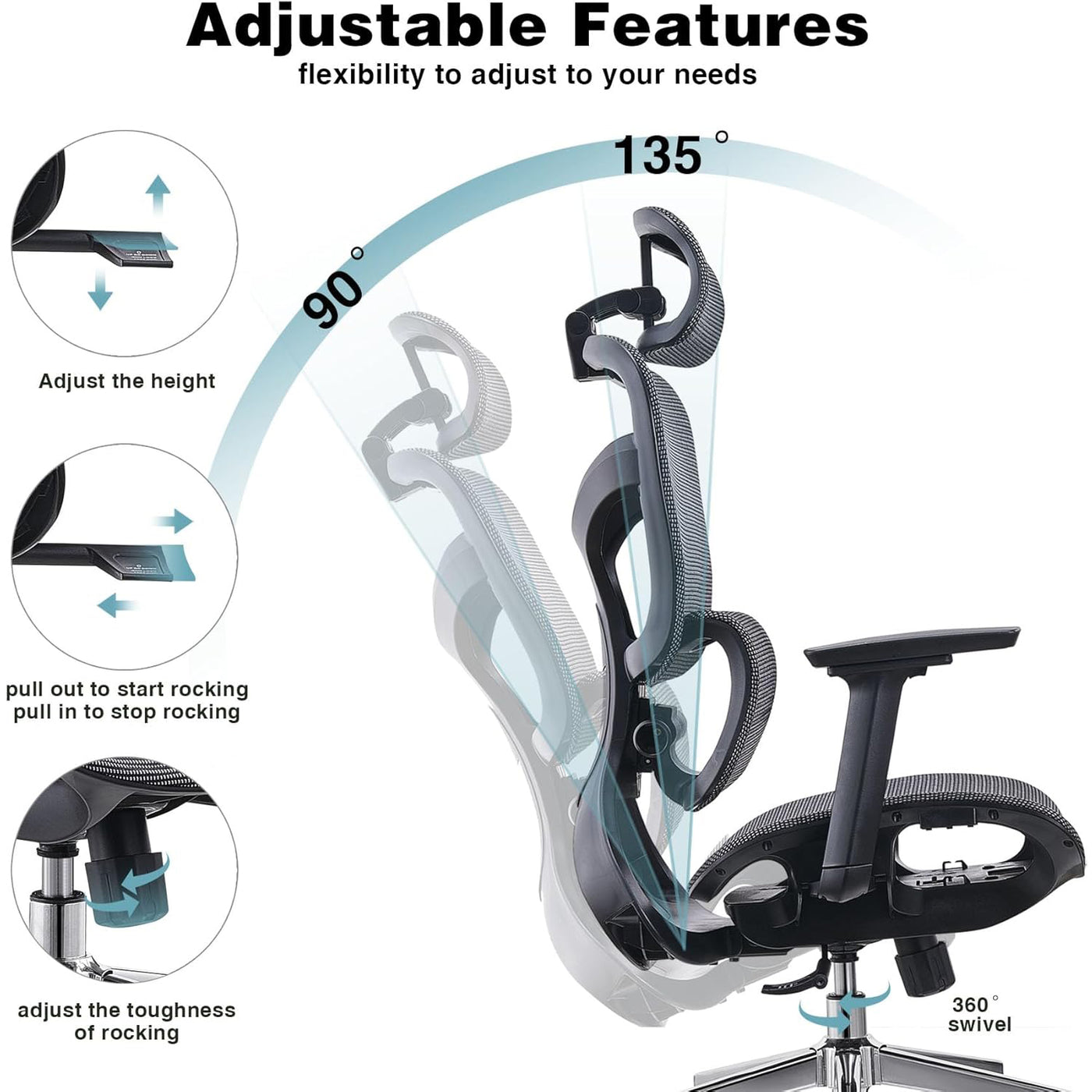 • [High Stability Backrest and High Elasticity Mesh Seat] The back shape adopts a double character design, with a more stable and solid structure. The high-quality mesh fabric makes the backrest more elastic and breathable.This office chair can be tilted at 105 °, 120 °, and 135 ° Of course, the height can also be adjusted up and down The seat cushion adopts a hollow mesh seat design and high elasticity special mesh support, providing you with ultimate seat comfort.