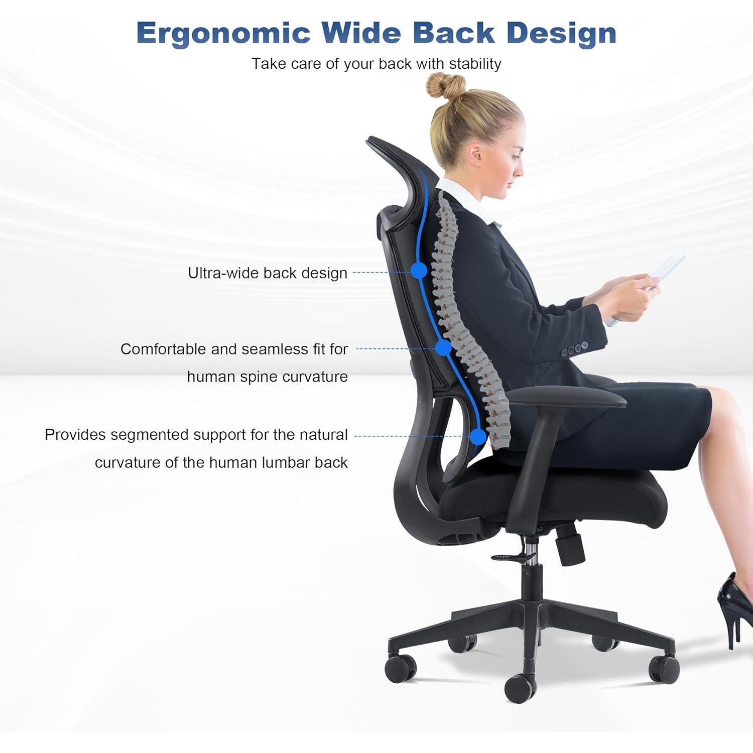 - [NEW UNIQUE HEADREST AND BACKREST] This office chair 480mm enlarged wider headrest, curved design fits the cervical curvature, all-round support for the neck. At the same time, according to the natural curvature of the human lumbar back design segmentation support system using a wider back, upper and lower separation of the back structure design, comfortable and seamless fit the human cervical curvature, independent lumbar support lumbar discs to give more powerful support.