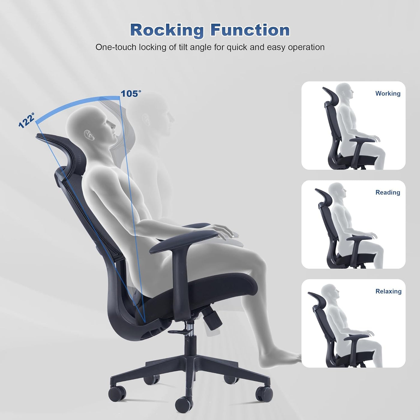 • [HIGH QUALITY AND ADJUSTABLE SUPPORT] This office chair has successfully passed rigorous tests such as 102 kg push back test and 950 kg hydrostatic pressure test, and the GAS rods have been certified by SGS to ensure safety. The backrest of the office chair is made of high quality polyester mesh, 6cm extra thick memory sponge cushion, which is breathable, flexible and anti-deformation. Meanwhile, it can be freely adjusted according to your weight or height by adjusting the seat height or backrest tilt (105°-122°) through the adjusting lever.